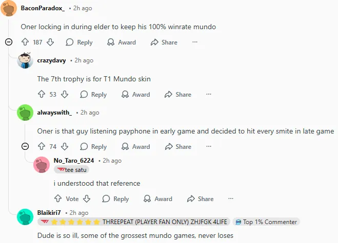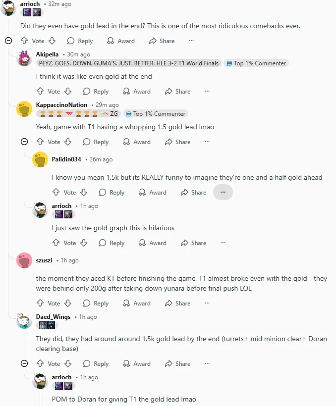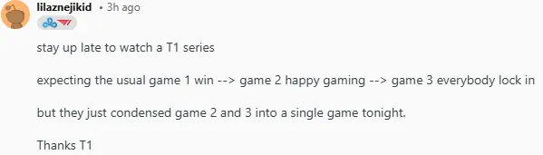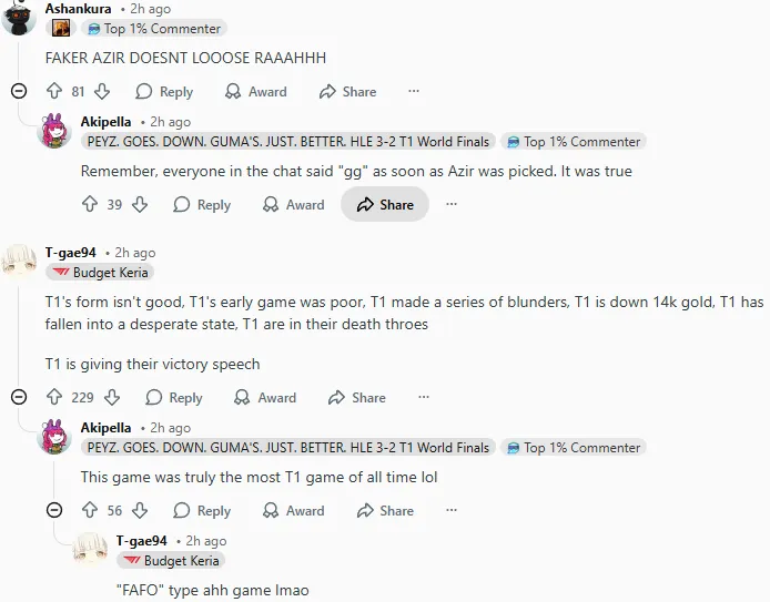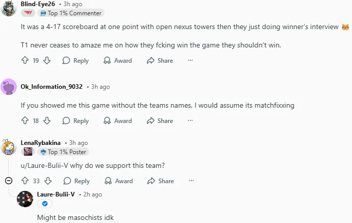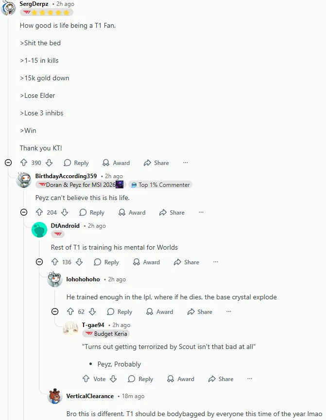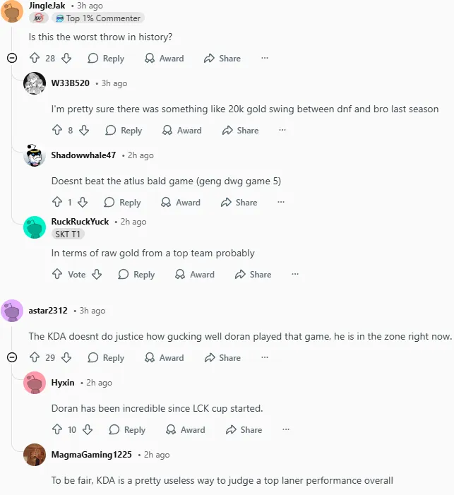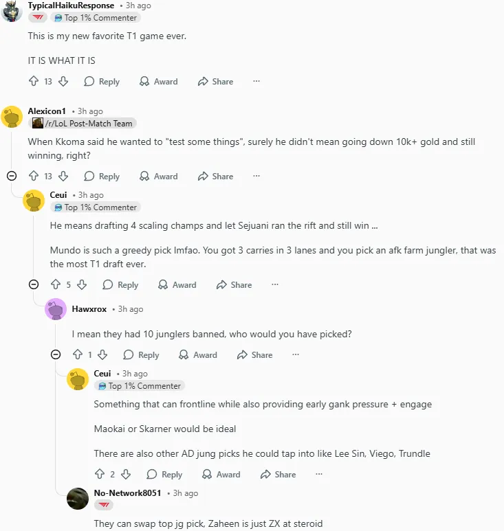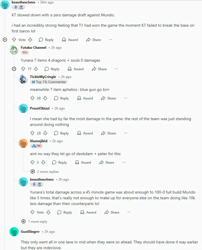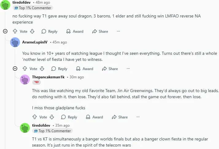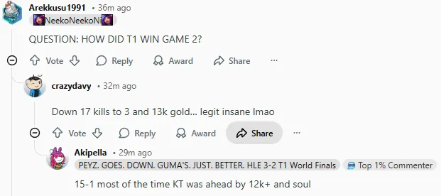 今日LCK杯比赛中T1以2-0战胜KT,其中第二局T1曾一度落后接近14k经济最后实现大翻盘,赛后国外论坛Reddit引发热议,部分评论翻译如下: